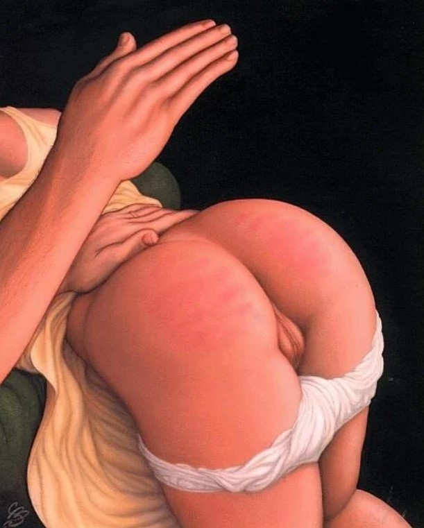 Title: Notice how her cunt lips are swollen with excitement. That's why you should spank her regularly.