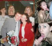 Sex party slut wearing a very tight knee length PVC Skirt & stockings at sex party giving a Blowjob